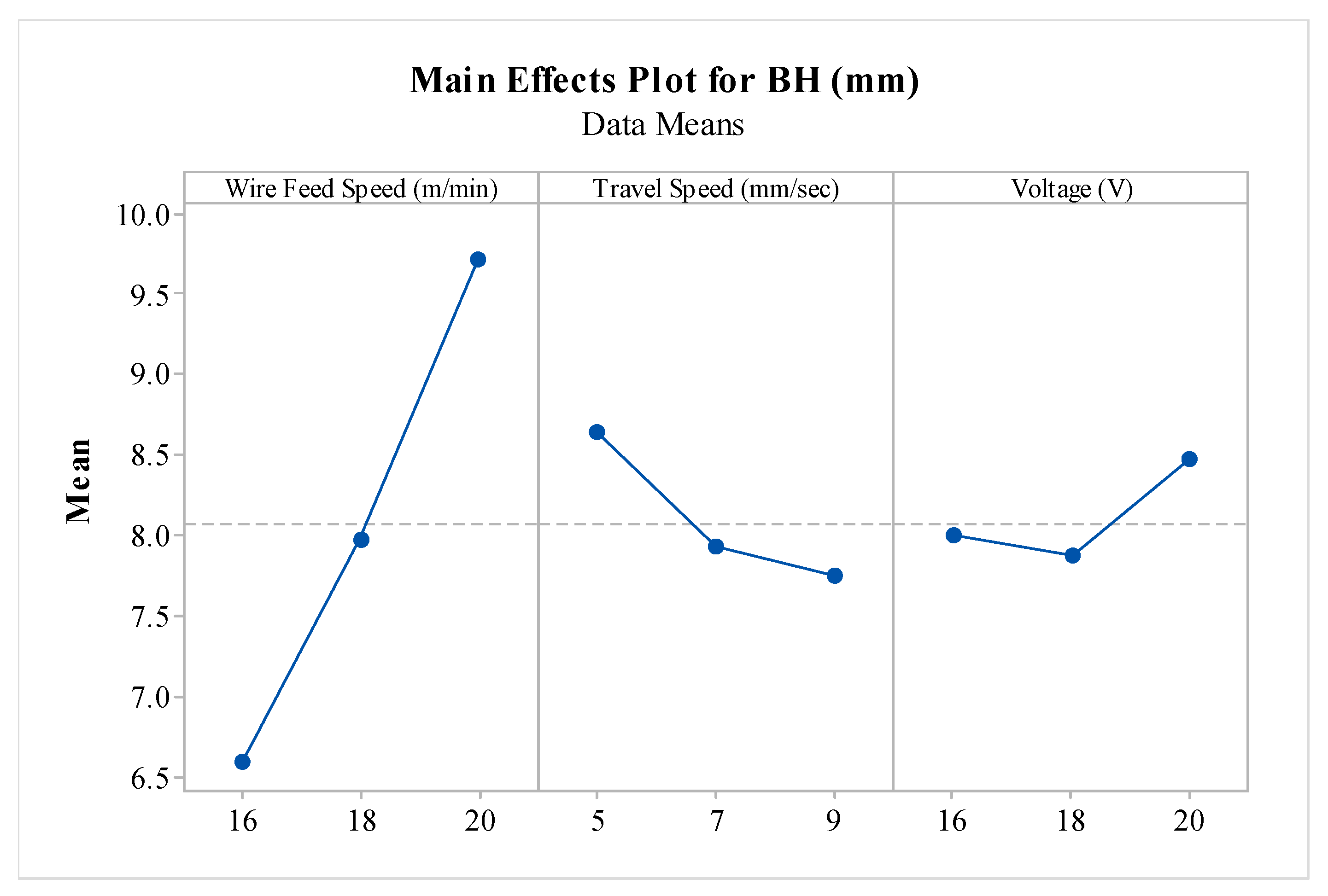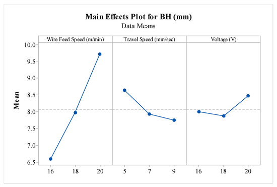 Figure 6 illustrates the influence of design factors on the bead height (BH) response. An increase in wire feed speed (WFS) resulted in a corresponding rise in BH, as WFS plays a critical role in shielding the weld pool from atmospheric contaminants. The increase in WFS leads to a higher rate of material deposition due to the accelerated delivery of molten wire from the nozzle, thereby increasing the weld bead height [57]. This explains the notable increase in BH with higher WFS values, attributed to intensified material deposition. Conversely, a decrease in BH was observed as travel speed (TS) increased from 5 mm/min to 9 mm/min. This trend can be attributed to the reduced material deposition caused by the faster movement of the welding torch, which limits the time available for material accumulation at a given point [58,59]. The influence of voltage (V) on BH was relatively minor. As the voltage increased from 16 V to 18 V, BH initially decreased and then slightly increased, indicating a weak or nonlinear effect [60,61]. The observed trends for bead width (BW) in response to variations in process parameters were consistent with findings reported by Mai et al. [62] and Dinovitzer et al. [63]. Based on the main effect plots, the optimal WAAM parameter settings for maximizing BH were identified as follows: voltage = 20 V, travel speed = 5 mm/s, and wire feed speed = 20 mm/min.