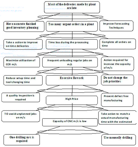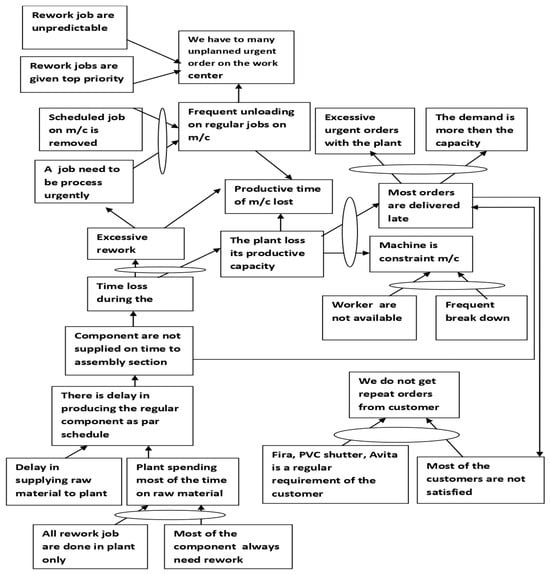 During this stage, one needs to identify the constraint in the manufacturing line. Any machine can become a constraint because of its mechanical problems or organizational policies. At the time of installation, the plant capacity was theoretically balanced. Constraints are identified through the analysis of machine downtime, rework, and scheduling issues. Undesirable Effects (UDEs) are outcomes that negatively impact organizational goals, identified as part of the TOC analysis. Late deliveries, frequent job unloading, excessive rework, and worker unavailability were observed. These UDEs were structured using a Current Reality Tree (CRT) to identify the core problem. A diagnostic tool was used based on the TOC to map cause–effect relationships between UDEs to identify the core problem and to seek causal relationships between these UDEs and possible causes. The CRT based on UDEs is shown in Figure 2. Data were collected through the direct observation of production processes at the case study company, combined with system data analysis of CNC machine logs, production schedules, and output records. Additionally, informal interviews with plant operators and supervisors were conducted to validate observed bottlenecks and contextualize system data. This triangulated approach (observation + system data analysis + informal interviews) ensured the reliability and accuracy of the findings.