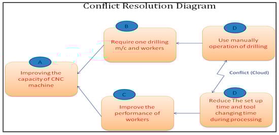 Figure 3 illustrates the conflict diagram between the two opinions. For improving the performance of the CNC machine, the two opinions are “use manual operation of drilling” and “reduce the setup time and tool changing time during processing.