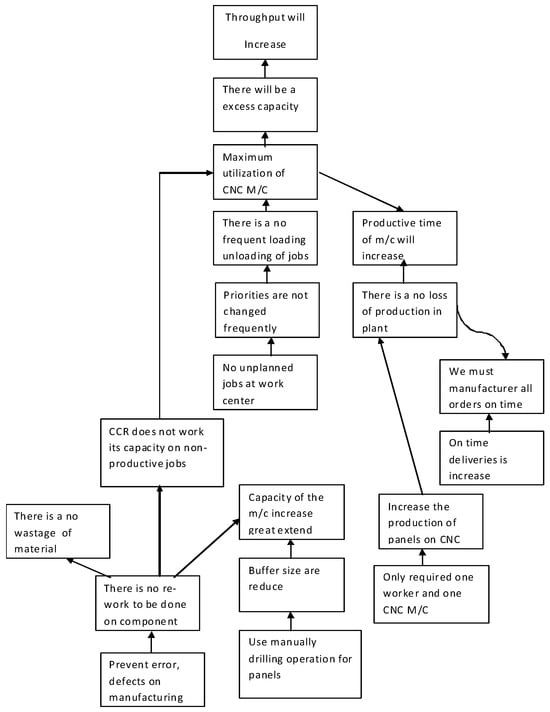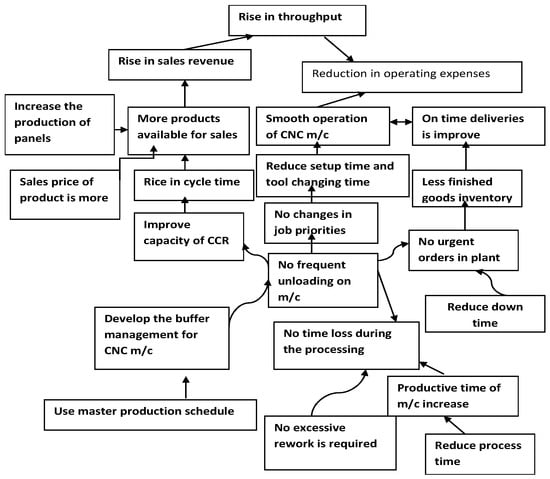 The Future Reality Tree (FRT) is a TOC tool that maps proposed solutions to the expected improvements they will yield. The FRT provides clarity and understanding that allows an individual to see exactly where the solution set comes from, its real impact, and why it is critical that compromises are not made around redefining and implementation. The FRT constructed in the above case is shown in Figure 6. The primary idea of using manual drilling would take care of uncertainties in CNCs and other resources by means of time buffers. It would also avoid the regular loading and unloading of jobs in CNCs. The master production schedule can be used to address capacity constraints for the resource and to develop a time buffer management CCR.