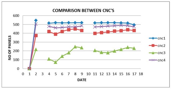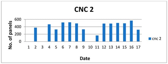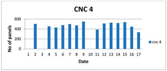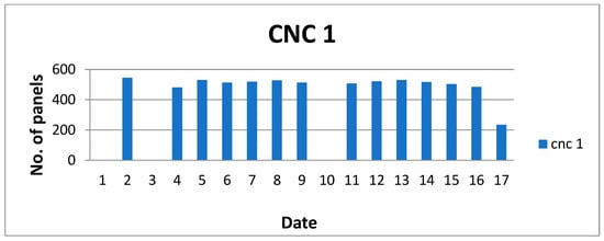 The production data collected from the case study company (Table 1 and Table 2, Figure 9 and Figure 10) were analyzed to identify system bottlenecks. A comparative study of the four CNC machines (CNC-1 to CNC-4) revealed that CNC-3 consistently underperformed relative to the others. While CNC-1, CNC-2, and CNC-4 maintained stable throughput levels, CNC-3 displayed frequent downtime and lower panel output. This imbalance highlighted CNC-3 as the primary capacity constraint within the production system.