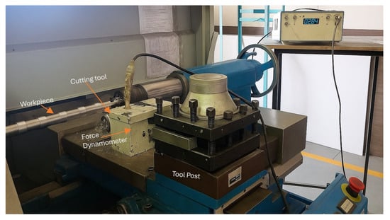 The experimental findings based on turning show that spindle speed plays a major role in cutting forces. The thrust force and the feed force both diminish with a rise in RPM since the faster movement of the workpiece better enhances efficiency, and there are fewer changes in chip thickness in each revolution, which consequently reduces the force in the cutting and feed route. Radial force is low and varies around zero, which indicates good tool stability and the minimum lateral deflection. Regarding the machining time, forces are greater when the tool enters the workpiece, are at the highest during the mid-cut, and are symmetrically smaller as the operation of the tool reaches the end, in simple terms, forming a parabola pattern. The components of force, feed force, thrust force, and the lowest radial force show that the majority of the cutting power is used in moving the tool into the material, and this also implies that the lateral instabilities are at lower levels, which is a positive indication for dimensional accuracy and surface finish. Based on cutting force distribution with spindle speed, thrust force (Fz) depicts a downward trend with a rise in RPM due to effective chip ejection and minimal spindle contact between the tool and workpiece as a result of adding lubrication. Feed force (Fy) goes up a bit in the mid-RPM range and then levels off or decreases, indicating that feeding force is more smoothly assisted through lubrication. Radial force (Fx) is the lowest with little change, which is evidence that it has great radial stability and few vibrations. This behavior is further confirmed by examining cutting forces versus machining time when there is agreement in the predicted and measured forces. The force is the highest with feed force (~1012 N), intermediate with thrust force (6–7 N), and the smallest with radial force (−5 to −4 N) and shows uniform cutting performance with the minimum deflection of tools. Bar chart data support this trend: feed force (~10 N) is much higher than thrust (~5 N), then radial (~3 N), and this is to be expected when turning, as the chip flow directly opposes feed force. On the whole, wet machining involves cool and lubricating features, which lower the temperature on the tool–chip interface and lead to friction and the possible occurrence of a built-up edge (BUE), particularly in aluminum alloys such as Al6061. The fact that the thrust force decreased as the spindle speed was increased demonstrates the enhanced cutting performance, whereas the generated force profiles remained at the same level, which confirms that the tool wear was minimized. The overriding feed force justifies the necessity to adjust the tool geometry and feed rate to yet again increase the cutting efficiency when turning wet surfaces.