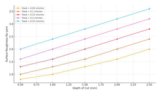 In dry machining, Ra increases the DOC for different feed rates, as shown in Figure 2. In dry machining at higher IPM, the roughness increases more sharply, and the surface finish tends to worsen as both feed and depth increase.