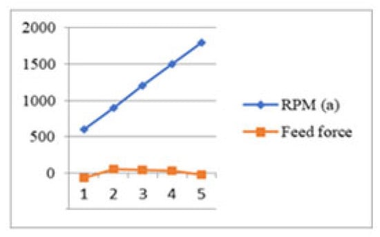 The above graph (Figure 4) shows the thrust force as a function of spindle speed (RPM) for each of the five experiments. The blue line shows the steady incremental increase in spindle speed between 600 RPM and 1800 RPM max, as was performed for each of the five trials. The thrust force is shown as a decreasing orange curve from a small positive value to about −100 at the end of the final trial. This implies that spindle speed and thrust force are inversely related, i.e., a lower thrust force is experienced when higher spindle speeds are used in machining.