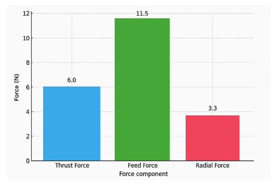Figure 12 shows the magnitudes of three machining force components: thrust, feed, and radial forces. Feed force is the largest, with a value of 10 N. Thrust force has a medium value of approximately 5 N, whereas radial force is the smallest with a value of approximately 3 N. It is very clear from the graph that feed force overwhelms the distribution of forces in machining.