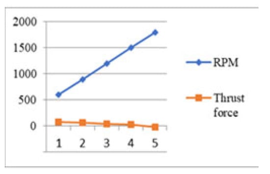 Figure 8 presents the variation in RPM and thrust force under five different test conditions. The blue diamond line is for RPM, which rises continuously from about 600 to 1800. The red line with squares represents thrust force, which reduces slowly over the same conditions. Though RPM remains in a linear ascending trend, thrust force demonstrates a minor declining trend. This implies that with an increase in RPM, the thrust force reduces, indicating an inverse proportion.