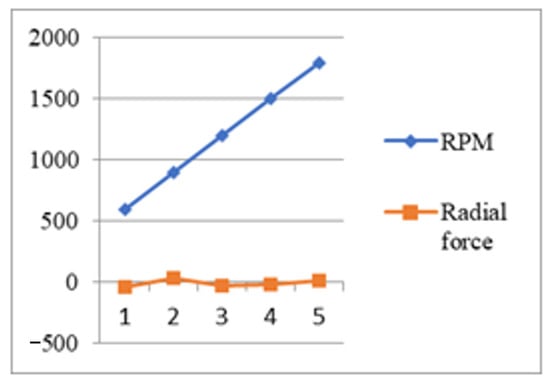 Figure 10 shows the change in RPM and radial force in five test conditions. The blue diamond line shows a linear, constant rise in RPM from approximately 600 to 1800. The orange line with squares is representative of radial force, varying a little but staying close to zero. Unlike RPM, radial force shows no clear increasing or decreasing trend, indicating stability. In general, as the RPM rises considerably, the radial force is almost constant with little variation.