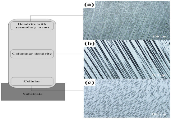 The longitudinal section microscopic appearances of the top, middle, and bottom different parts (a) dendrite with secondary arms, (b)columnar dendrite, (c) celular [23].