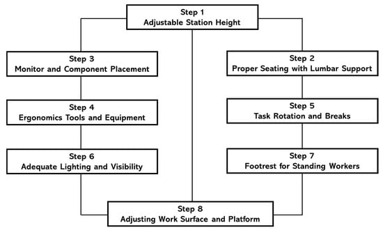 There were a few ergonomic design interventions to be used to address the ergonomic problems as identified, specifically the high degrees of discomfort in the neck, lower back, and shoulder. The suggested major steps for an ergonomic workstation and equipment at company XYZ are depicted in the process flow in Figure 4.