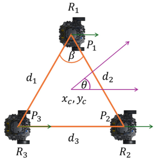 Triangular arrangement of the formation of three mobile robots.