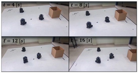 This section describes the experimental validation of the proposed control scheme for the formation and obstacle avoidance of a group of three mobile robots. The following initial conditions were taken into account for the experiment: the three robots were positioned at coordinates , , and , thus forming an equilateral triangle with sides of . The total duration of the experiment was 16 s. The robot parameters were: ; ; ; ; ; ; . For the proportional formation controller, the diagonal gain matrix was used. For the obstacle avoidance controller, the design parameters were set as , , and . The mechanical impedance parameters were set as and . A repulsion area of was defined. The evolution of the formation during the experiment can be seen in Figure 5, which shows snapshots at four representative moments: , and . These moments reflect the behavior of the system both in terms of convergence to the desired formation and in terms of response to obstacles.