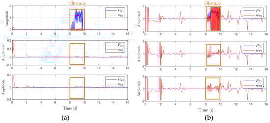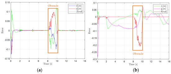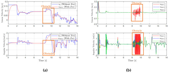 Figure 6a compares the velocities induced by the Novint Falcon joystick with and without the mechanical impedance model . Incorporating produces smoother, more continuous responses, damping user actions and enhancing stable human–robot interaction. Figure 6b shows the linear and angular velocities of each robot. Between s and t = 10 s, robot 1 exhibits a velocity change coinciding with obstacle detection, reflecting the action of the obstacle avoidance controller. Figure 7a,b show the evolution of the normal () and tangential () repulsion forces on robot 1. As the obstacle approaches, slows the robot linearly, while induces angular velocity oscillations, representing the dynamic compromise between collision avoidance and formation maintenance. Figure 8a,b show the errors associated with the shape and posture variables, respectively. During the first of the experiment, the errors remain low, indicating stable behavior and a well-maintained formation. However, between and , coinciding with the appearance of an obstacle. Once the obstacle leaves the repulsion area, the errors decrease rapidly, demonstrating the formation controller’s ability to efficiently recover the desired configuration.