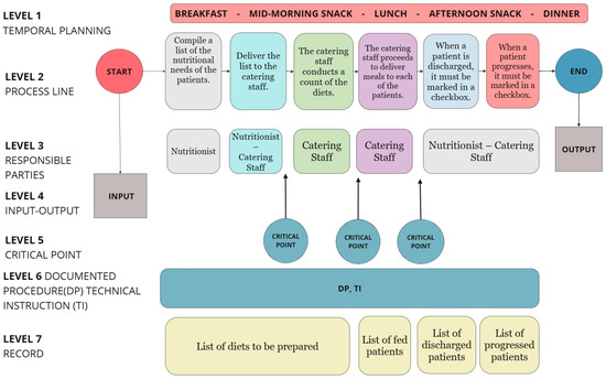 Figure 1 details the catering service process in a multi-level diagram. There are five meals to be delivered: breakfast, mid-morning snack, lunch, afternoon snack, and dinner. The menu is prepared according to the details provided by the hospital nutritionist. The catering staff coordinates the preparation, distribution, and delivery of food according to patient lists for each scheduled meal. Diet and patient lists are manually prepared on a spreadsheet and delivered to the record keeper in printed form. Once the dishes are ready, the catering staff distributes the food according to the patient list, where they must manually annotate whether the patient has received the food or rejected it, with any other observations.