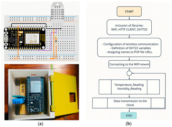 (a) Electronic circuit and implementation of the sensor node; (b) flowchart of the NodeMCU algorithm.