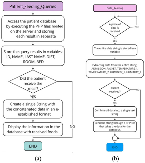 For storing patient registration data and available products in the warehouse, different unrelated data tables were created in a MySQL database. The table named “patients” is the main one, as it stores patient data such as names, surnames, medical history, and dietary information. The patient data recorded includes ID number, name, surname, diet, room, and bed number. Figure 3 depicts the flowchart of the “Patient Feeding Queries” function, which is executed when a system user wishes to access the information. Furthermore, the “Data Reading” function outlines the steps taken to extract information from a request made through the application, such as patient data or the scheduled diet.