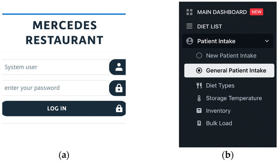 (a) Mercedes Restaurant login; (b) vertical menu of the web application.