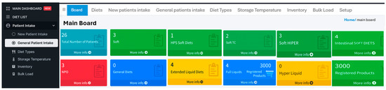 Figure 5 depicts the main dashboard of the application, where each diet is displayed according to the meal schedule (breakfast, mid-morning snack, lunch, afternoon snack, and dinner), along with the total number of hospitalized patients.