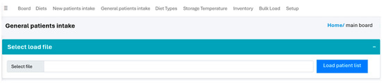 Patient information and diets can be entered into the web application. An Excel spreadsheet was printed and handed to the catering staff beforehand, with manual records kept. Figure 6 displays the section for general patient entry, where the patient list is uploaded in an Excel spreadsheet along with their respective dietary information, which is then stored in the database for future reference.
