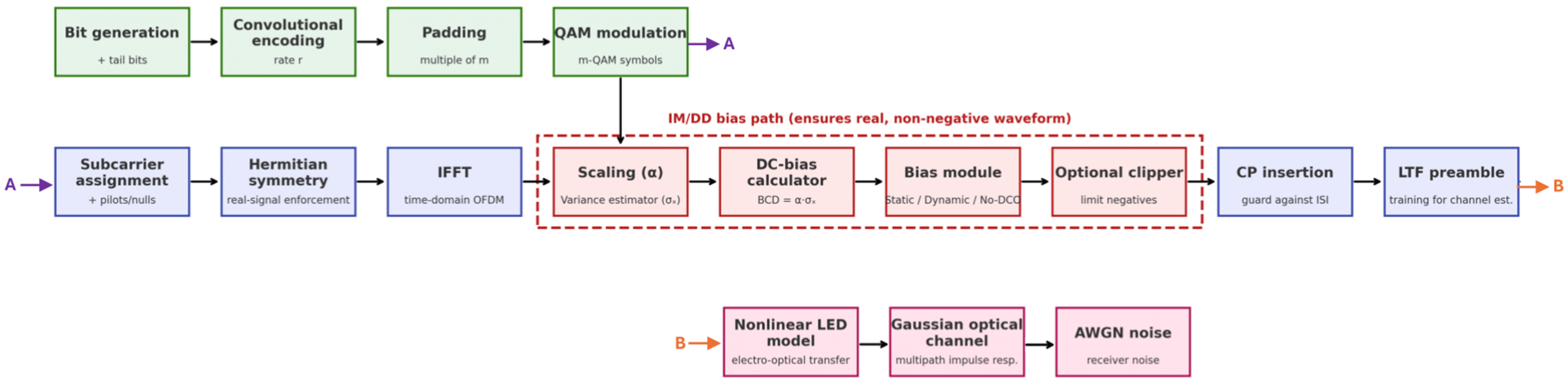 4]. Direct Current-biased Optical OFDM (DCO-OFDM) addresses this by adding a DC component that shifts the waveform above zero, preserving compatibility with optical frontends [