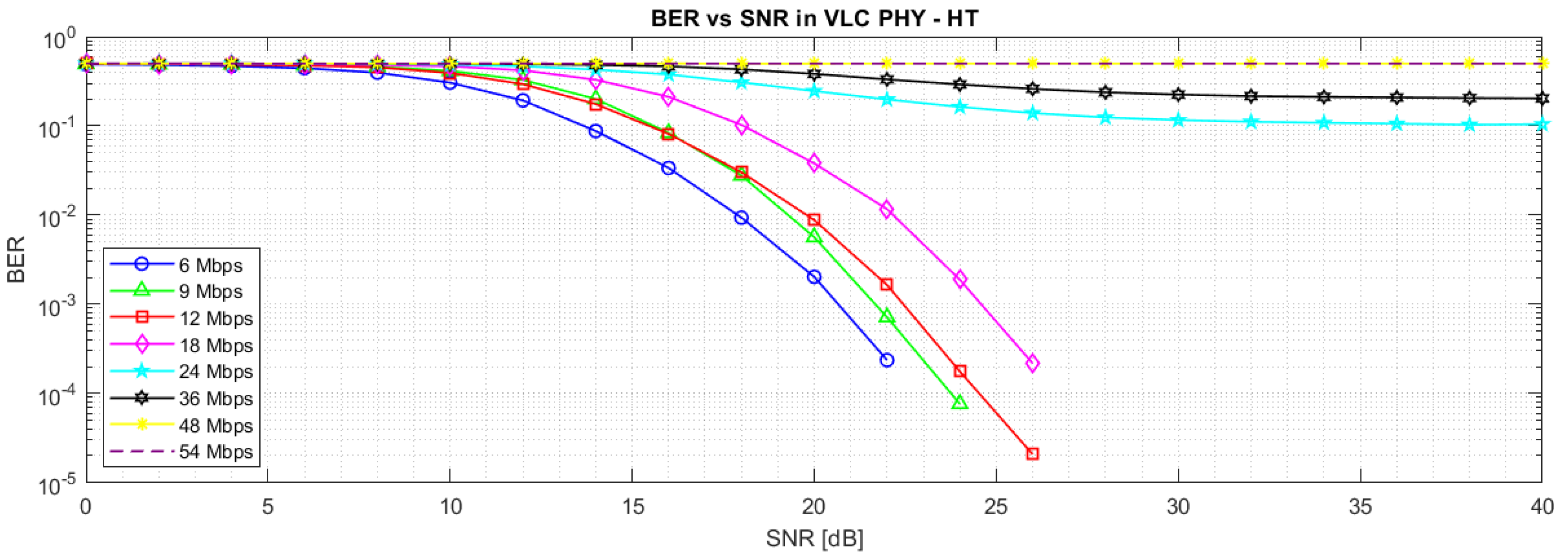 The main contributions are as follows: (i) a fully IEEE 802.11bb-compliant PHY implementation for VLC—covering OFDM, standard pilots, cyclic prefix, convolutional coding, interleaving, and scrambling; (ii) a joint bias–channel analysis that quantifies static, dynamic, and no-DCO (clipping) strategies across flat (), moderately dispersive (), and highly dispersive () optical channels with BER–SNR curves; (iii) standard-based design guidelines that map channel condition and SNR regime to the recommended PHY mode and bias strategy, clarifying robustness–throughput–power trade-offs across HT/VHT/HE; and (iv) brief complexity/power notes contrasting per-packet (static) versus per-symbol (dynamic) overhead and discussing implications of the mean DC level.