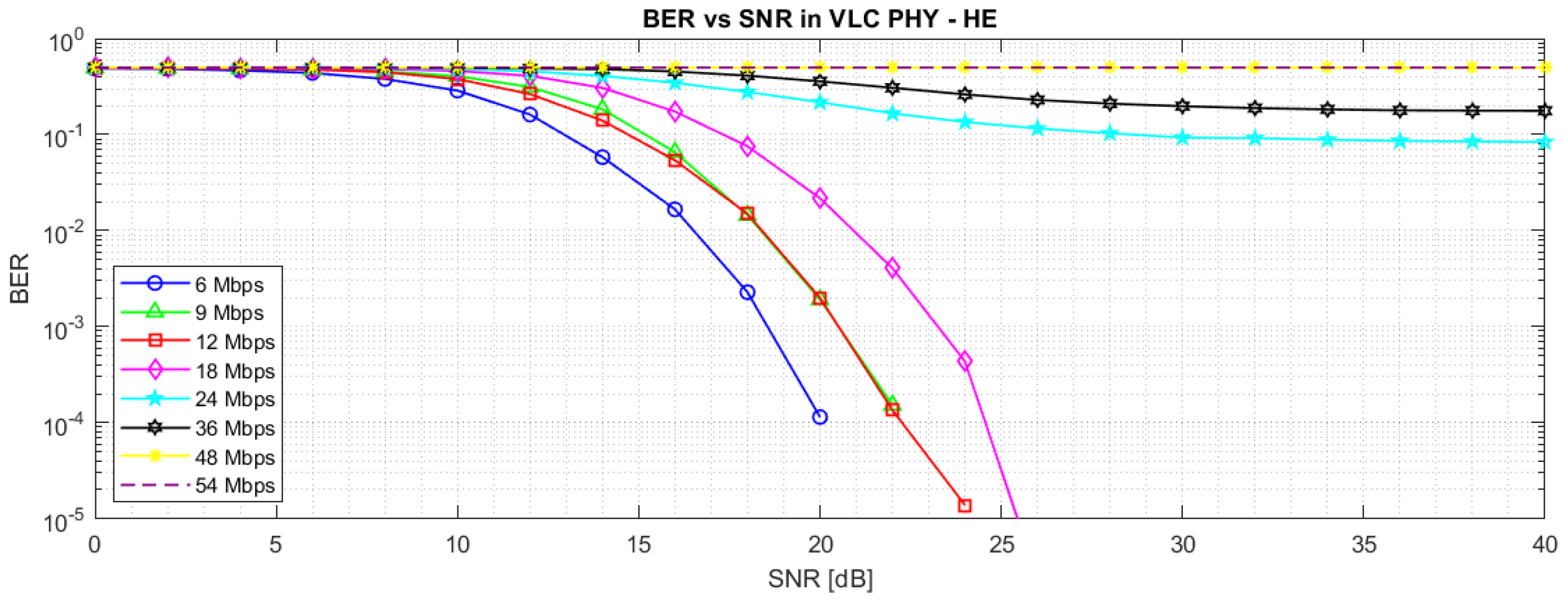 11]. However, these studies either lack BER-vs-SNR under a fully standard-compliant PHY or omit a joint comparison of static vs. dynamic DC-biasing across flat/moderately/highly dispersive channels and all three PHY modes. This work closes that gap by keeping full 802.11bb compliance (HT/VHT/HE; pilots/CP/coding/rates) and quantifying bias–channel–mode trade-offs via BER–SNR and SNR@BER = 10
