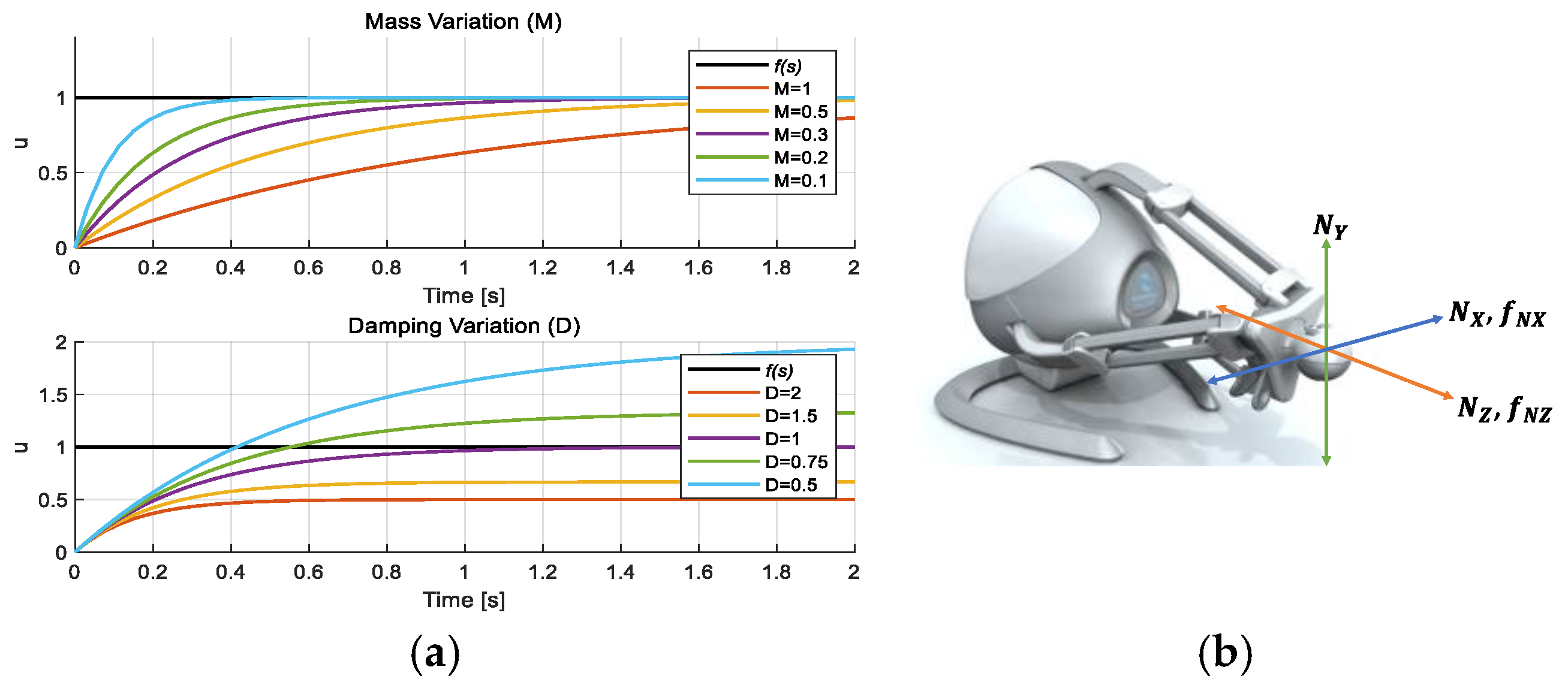 Figure 1. (a) Mechanical impedance response under variation of mass ( M ) and damping ( D ) ; (b) end-effector axes and induced force.