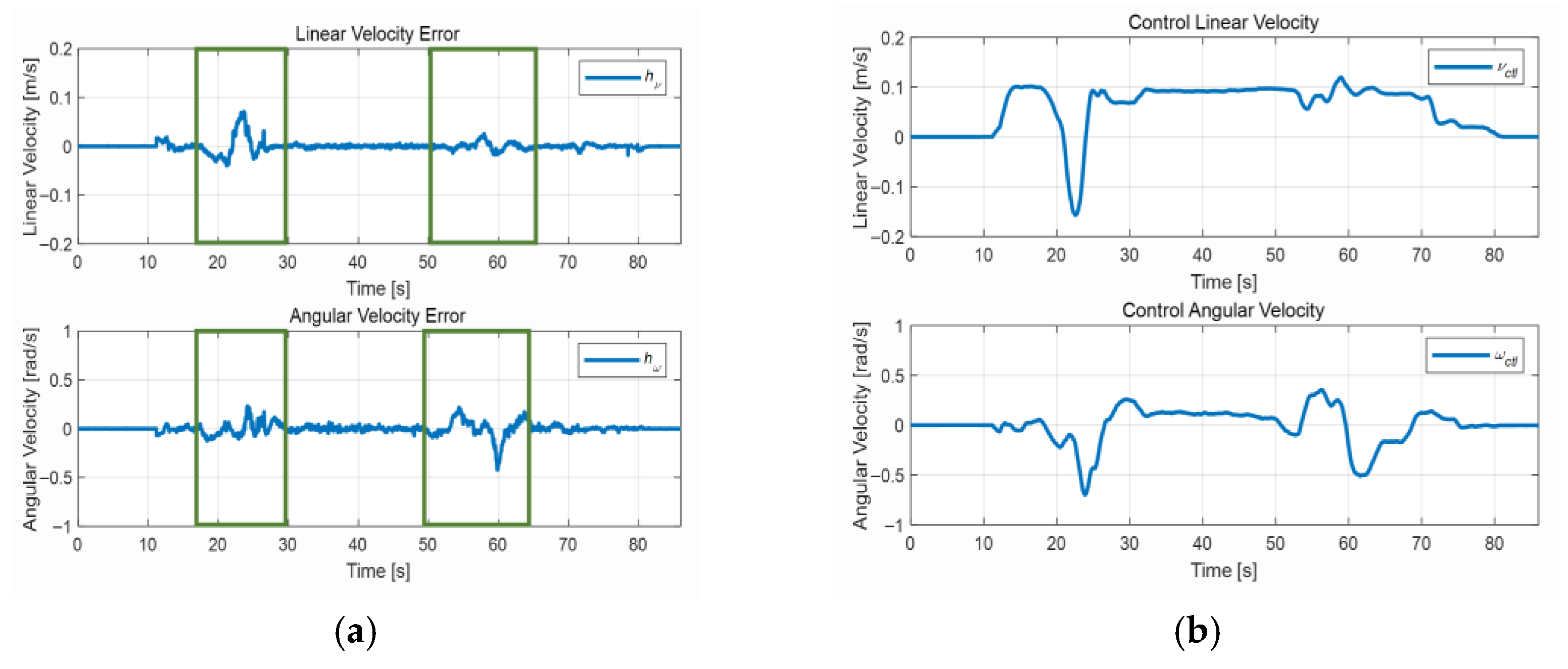 Figure 8. (a) Velocity errors of the robot; (b) control actions sent to the robot.
