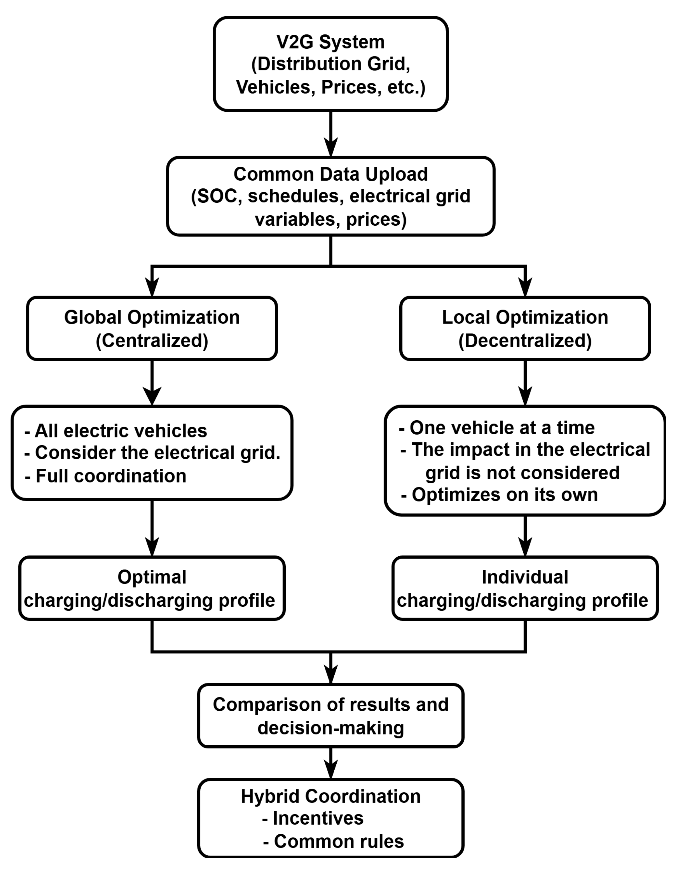 - Uncoordinated Strategies: This strategy is very commonly used and involves a scheme that does not take scheduling into account. As it is a process that does not consider coordination, it does not make use of optimization techniques or price tracking mechanisms. It can be related to a purely random process, simply taking into account the connection of the electric vehicle to the grid [17].