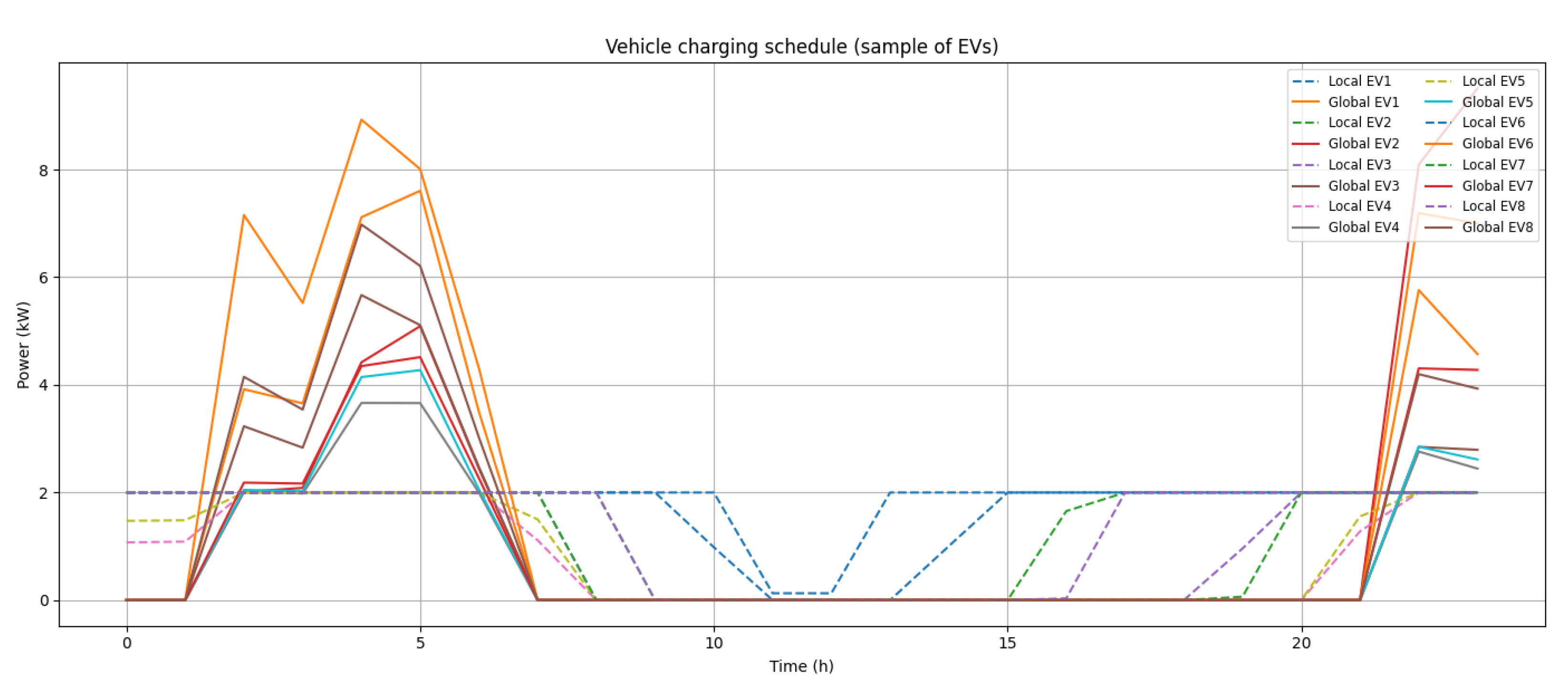 - Local Optimization: A specific power limit per hour is defined for each vehicle. Planning is carried out independently for each EV.