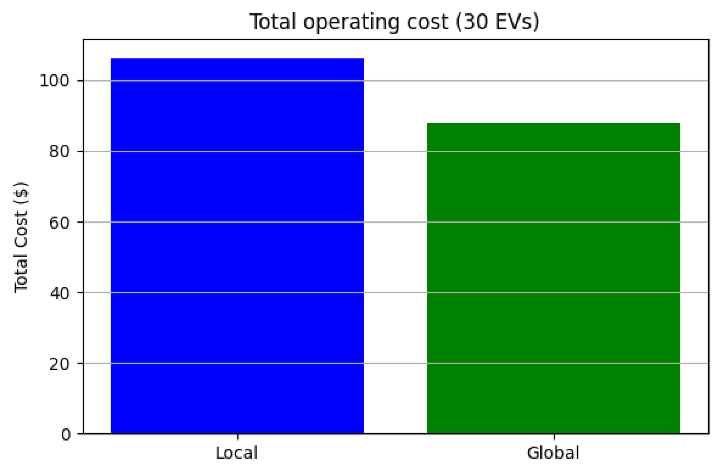 - Global Optimization Scenario: all vehicles will share a total power limit of 6 kW. In addition, the optimization process will decide how to distribute this energy to minimize the total cost.