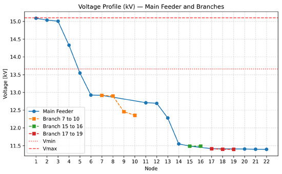 This simplification was intentionally adopted to isolate the intrinsic voltage–power coupling of the feeder under purely passive conditions, thus allowing a transparent analysis of the effect of DG reactive power flexibility. In practical feeders, voltage regulators and capacitor banks mitigate such effects, but their exclusion here provides a lower-bound estimate of voltage compliance, representing a conservative hosting-capacity benchmark. Future work will extend the model to reintroduce these devices and evaluate coordinated Volt/VAR control strategies under realistic operating conditions. The resulting topology is shown in Figure 1, where the node numbering follows the IEEE standard but only the phase A connections are represented.