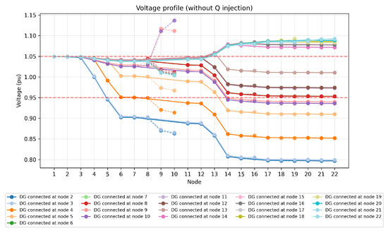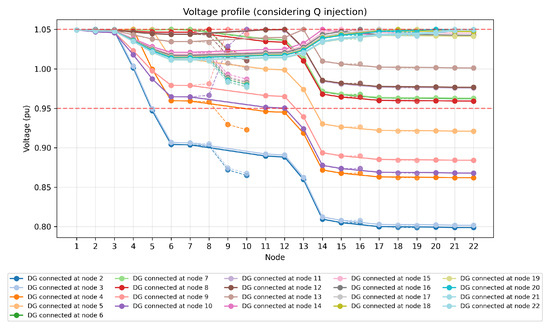 This section presents the results obtained from the OPF simulations for the two scenarios defined in Section 4. The analysis focuses on voltage compliance, reactive power utilization, and the impact of Q support on the number of feasible DG connection points.