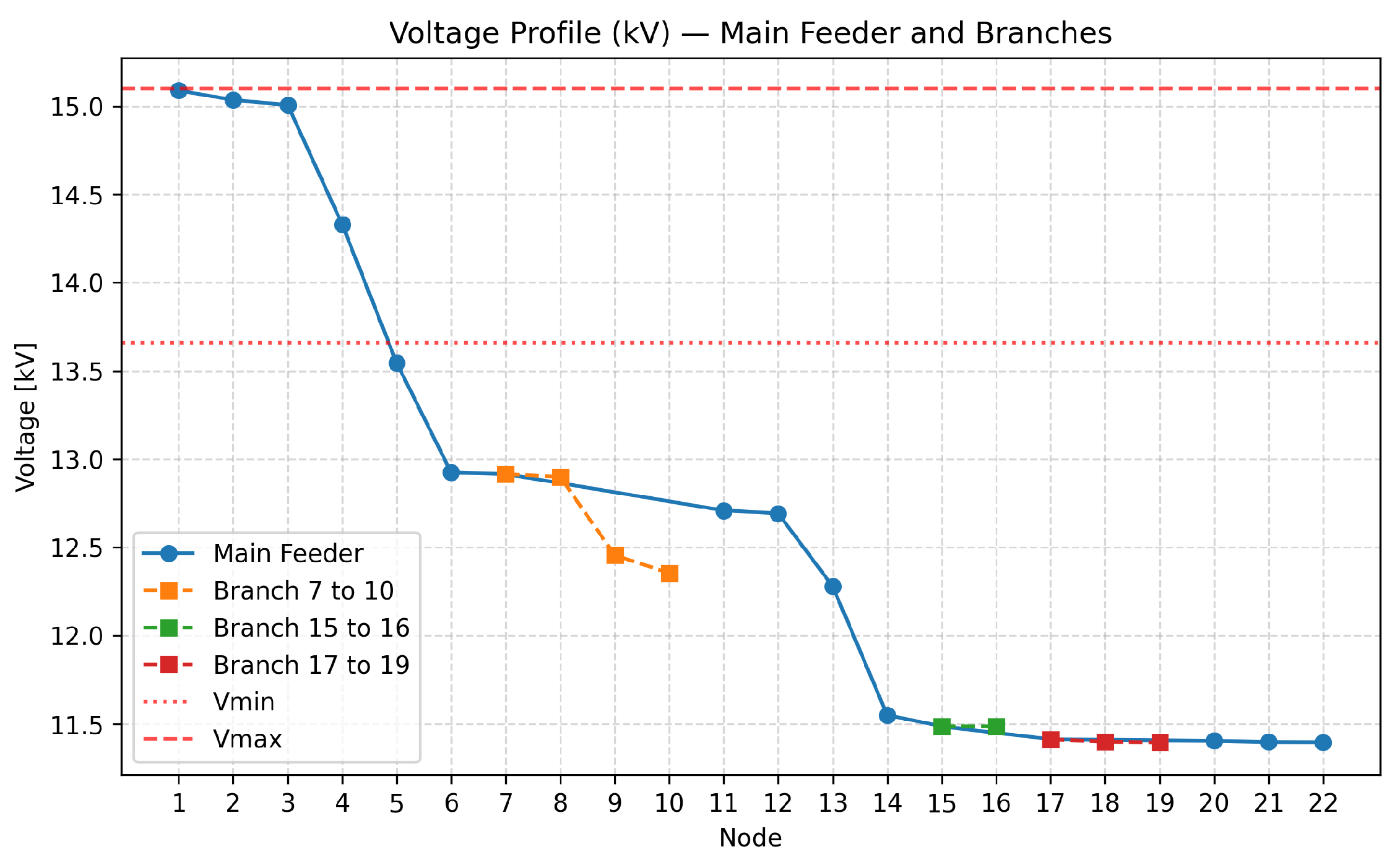 This simplification was intentionally adopted to isolate the intrinsic voltage–power coupling of the feeder under purely passive conditions, thus allowing a transparent analysis of the effect of DG reactive power flexibility. In practical feeders, voltage regulators and capacitor banks mitigate such effects, but their exclusion here provides a lower-bound estimate of voltage compliance, representing a conservative hosting-capacity benchmark. Future work will extend the model to reintroduce these devices and evaluate coordinated Volt/VAR control strategies under realistic operating conditions. The resulting topology is shown in