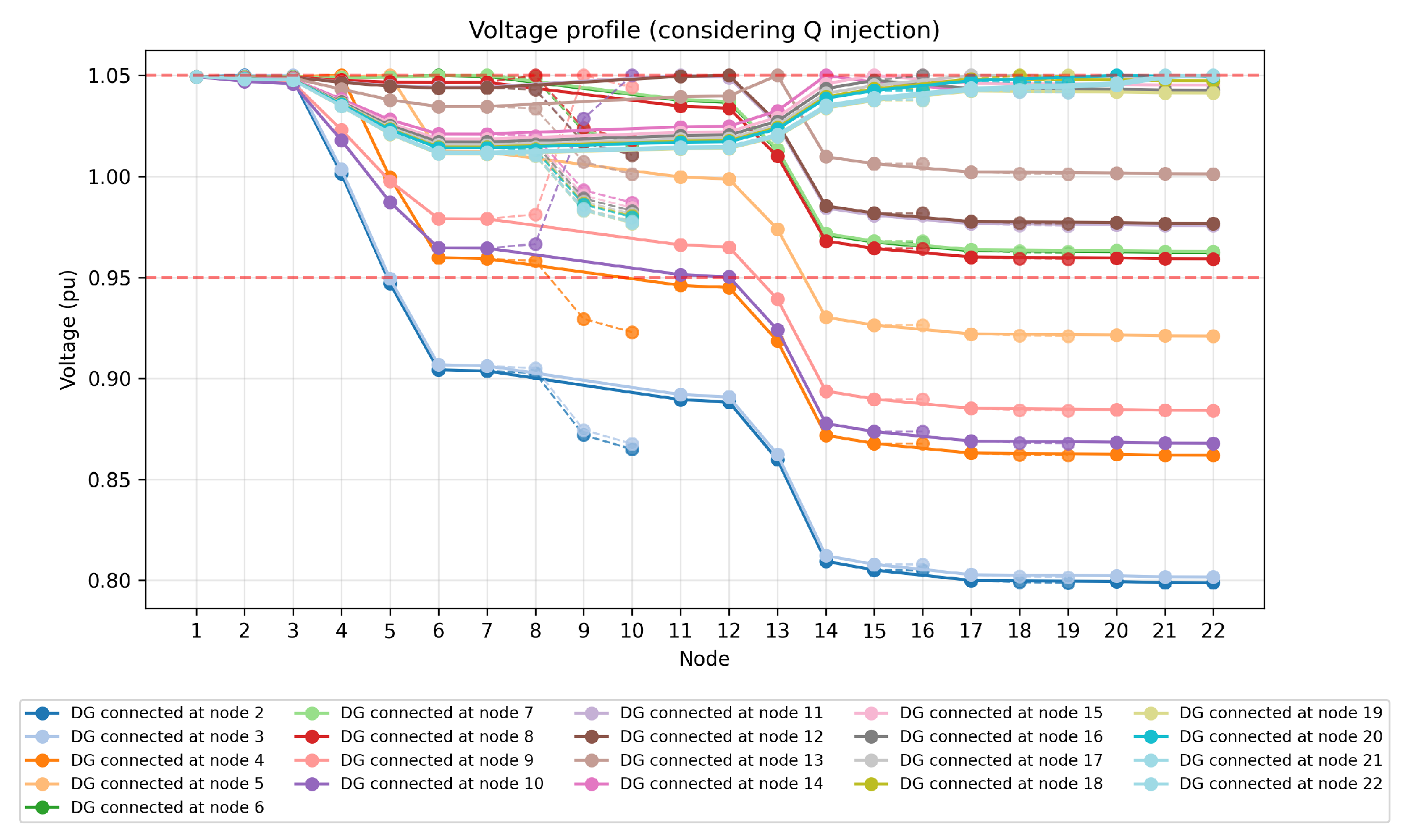 Reactive power support increases voltage compliance: Allowing the DG to inject or absorb up to MVAr significantly improved the minimum bus voltages and reduced the number of voltage limit violations across the network.
