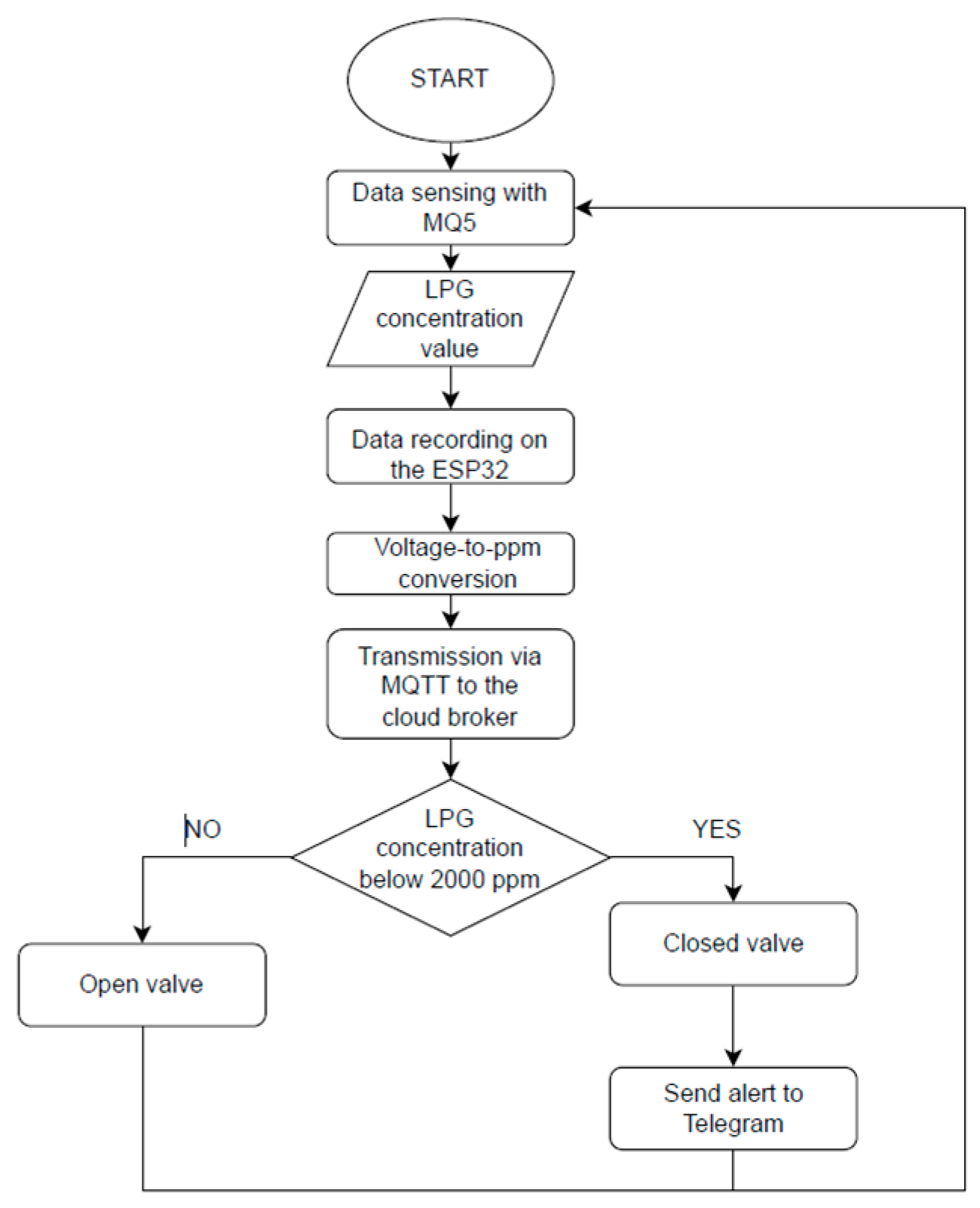 Figure 1 represents the system’s logical behavior, from initial gas reading to the automatic activation of response mechanisms. The MQ-5 sensor continuously monitors the LPG concentration, and the ESP32 sends the detected values to the server via MQTT. Suppose the system identifies that the concentration exceeds 2000 parts per million (ppm). In that case, the valve is closed via the servo motor, and an immediate alert is sent to the user through Telegram. The 2000 ppm threshold is defined based on tests performed directly on the prototype, where gas leaks were simulated using open lighters. These tests show that values above this range represent a real hazard. This decision is also supported by the EN 60079-29-1 standard, which states that sensors must generate alerts before reaching the Lower Explosive Limit (LEL) [