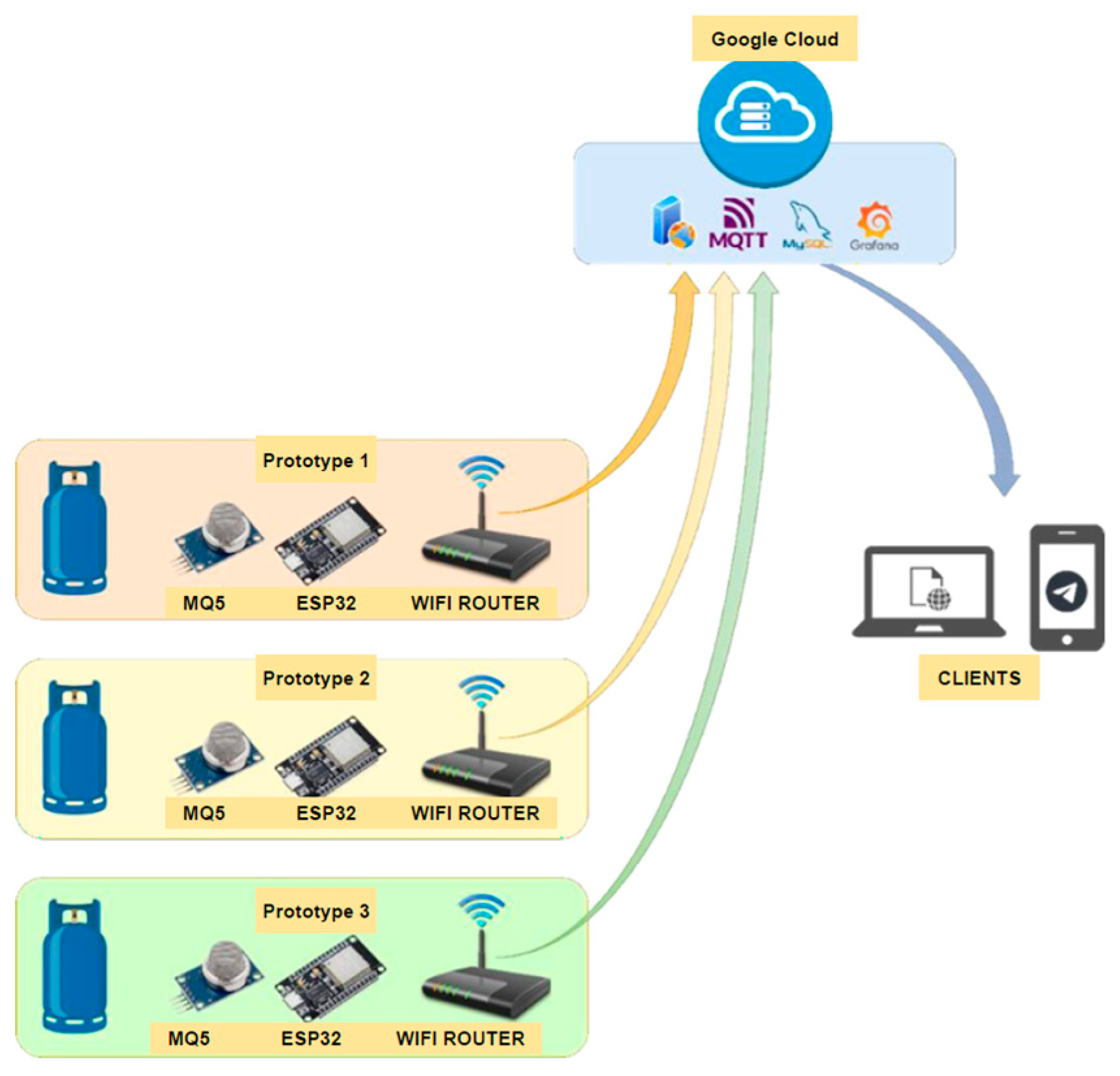 Figure 3 shows that each prototype connects via a local Wi-Fi network and sends telemetry to the cloud via MQTT. The cloud hosts services such as the Mosquitto broker for message transport, MySQL for storage, and Grafana for visualization. This architecture enables a secure and stable communication channel, allowing for scalability, and customers can access data queries in real time.