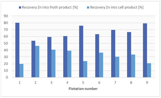 In the flotation process, the most effective separation method for zinc is using kerosene (4000 g/t), flotation 1, or kerosene (12,000 g/t) with potassium ethyl xanthogenate (200 g/t), flotation 9. However, considering economic and ecological factors, the best option is flotation 8, in which no collector was applied and still a significant reduction in zinc concentration (1.52×) was observed. The results of flotation tests with the purpose of zinc separation are presented in Figure 1. The results of flotation tests with the purpose of all risk metals separation are presented in Table 3.