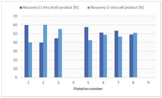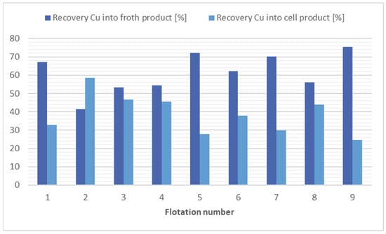 The analyses of the flotation tests of soil samples show that the collector combination of kerosene (12,000 g/t) and potassium ethyl xanthogenate (200 g/t) were most effective at separating copper from the soil, flotation 9. The flotation 9 achieved a 1.8 times reduction in Cu concentration in the cell product at a Cu recovery of 43.92%. On the other hand, flotation 7 is more economically and ecologically advantageous, where a similar result was achieved (1.7 times reduction at a Cu recovery of 48.77%), but only with the addition of potassium ethyl xanthogenate at 240 g/t. Furthermore, in flotation 8, where no collector was used, a 1.13 times reduction in copper concentration was achieved with a cell product mass yield of 50.59%. The results of the flotation tests for copper separation are shown in Figure 4.