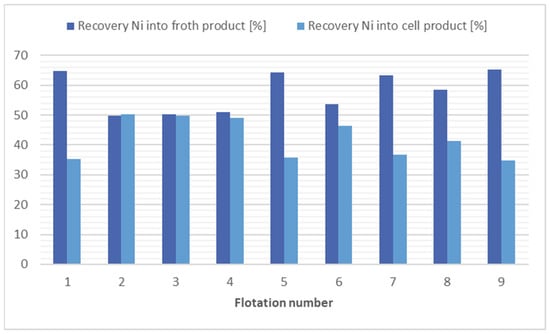 The findings of the flotation process for nickel separation suggest that the most efficacious methods appear to be the application of kerosene (4000 g/t), flotation 1, and the application of potassium ethyl xanthogenate (240 g/t), flotation 7. Taking into consideration the economic and environmental factors, it is evident that flotation 8 offers a relatively efficient solution. This approach involves the absence of a collector and yet achieves a substantial reduction in nickel concentration, with reduced levels (1.13 times). The results of the flotation tests for nickel separation are shown in Figure 3.