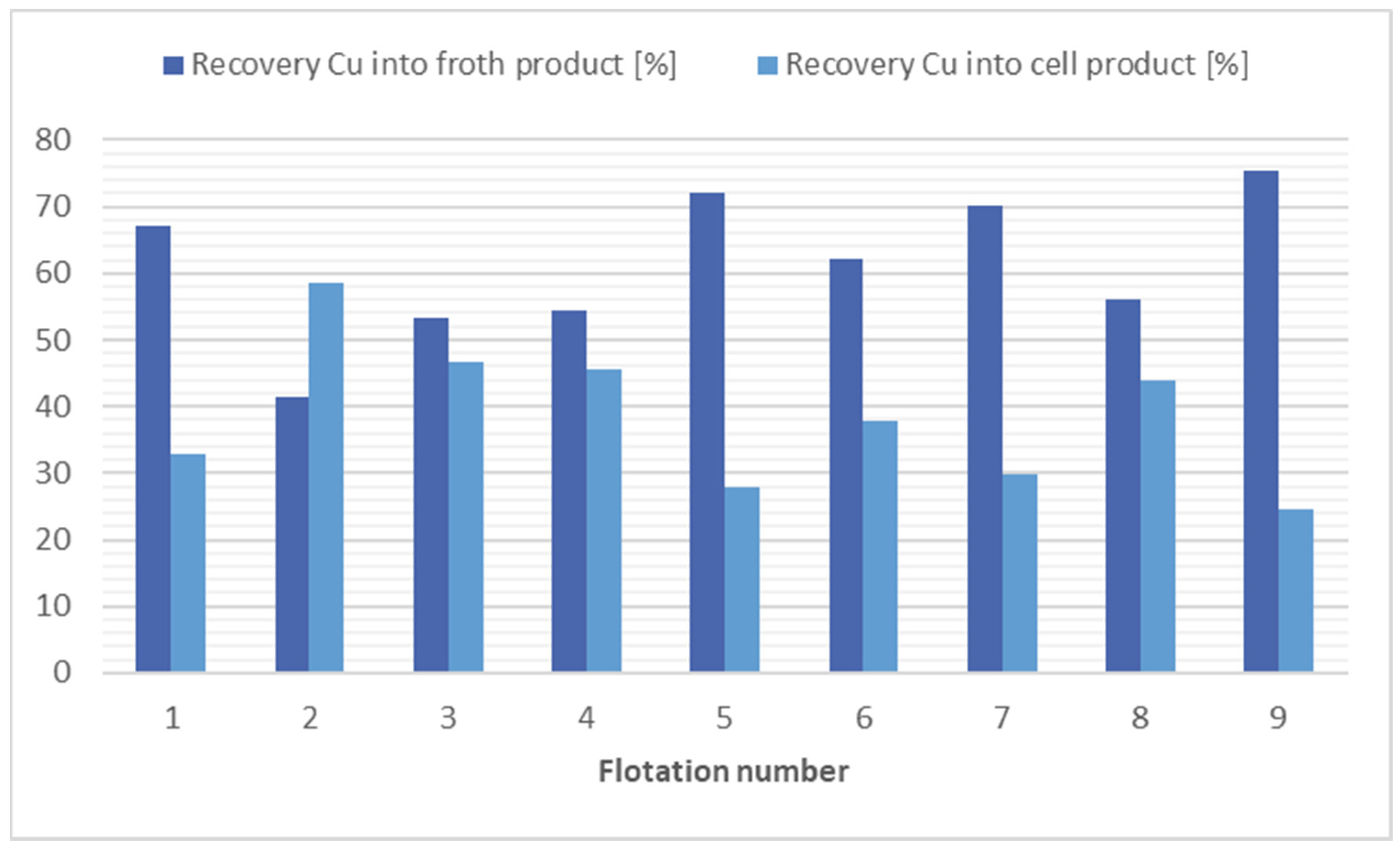 The analyses of the flotation tests of soil samples show that the collector combination of kerosene (12,000 g/t) and potassium ethyl xanthogenate (200 g/t) were most effective at separating copper from the soil, flotation 9. The flotation 9 achieved a 1.8 times reduction in Cu concentration in the cell product at a Cu recovery of 43.92%. On the other hand, flotation 7 is more economically and ecologically advantageous, where a similar result was achieved (1.7 times reduction at a Cu recovery of 48.77%), but only with the addition of potassium ethyl xanthogenate at 240 g/t. Furthermore, in flotation 8, where no collector was used, a 1.13 times reduction in copper concentration was achieved with a cell product mass yield of 50.59%. The results of the flotation tests for copper separation are shown in