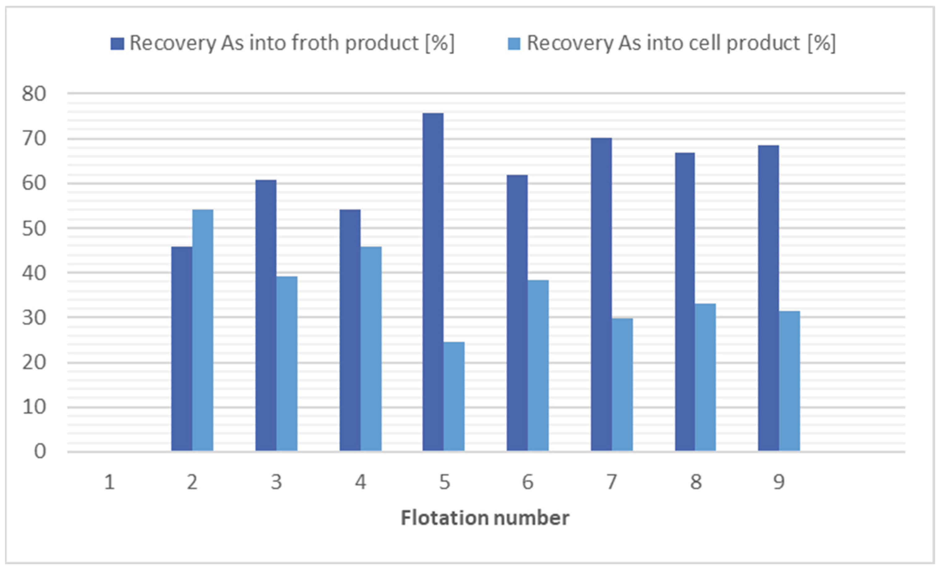 Based on the results of the flotations for arsenic separation, it appears that the most efficient is the use of kerosene (12,000 g/t) with potassium ethyl xanthogenate (200 g/t), flotation 9. With consideration of economic and ecological factors, it appears that flotation 8 is the best choice, where no collector was applied and still a significant reduction in arsenic recovery (1.5 times) was achieved. The results of the flotation tests for arsenic separation are shown in