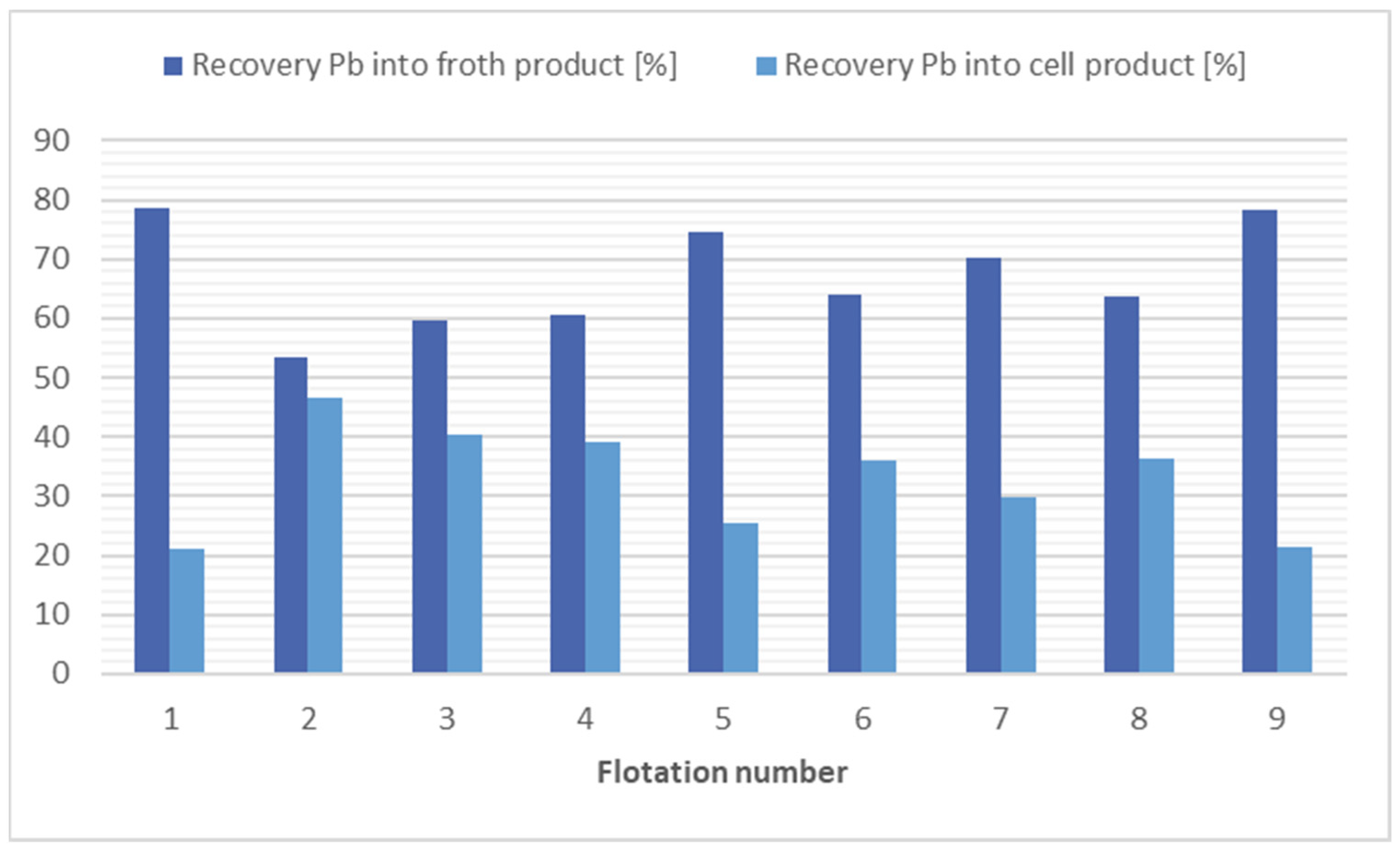 The greatest reductions in lead concentrations occurred in flotation 1 using kerosene at 4000 g/t and in flotation 9 using potassium ethyl xanthogenate (200 g/t) in combination with kerosene (12,000 g/t). In these flotations, the Pb concentration in the cell product was almost doubled; however, the mass yield was around 42–44%. Good results were also obtained in the flotation without collector application, flotation 8, due to the higher mass yield of the cell product (50.59%) and from an economic and environmental point of view. The results of the flotation tests for lead separation are shown in