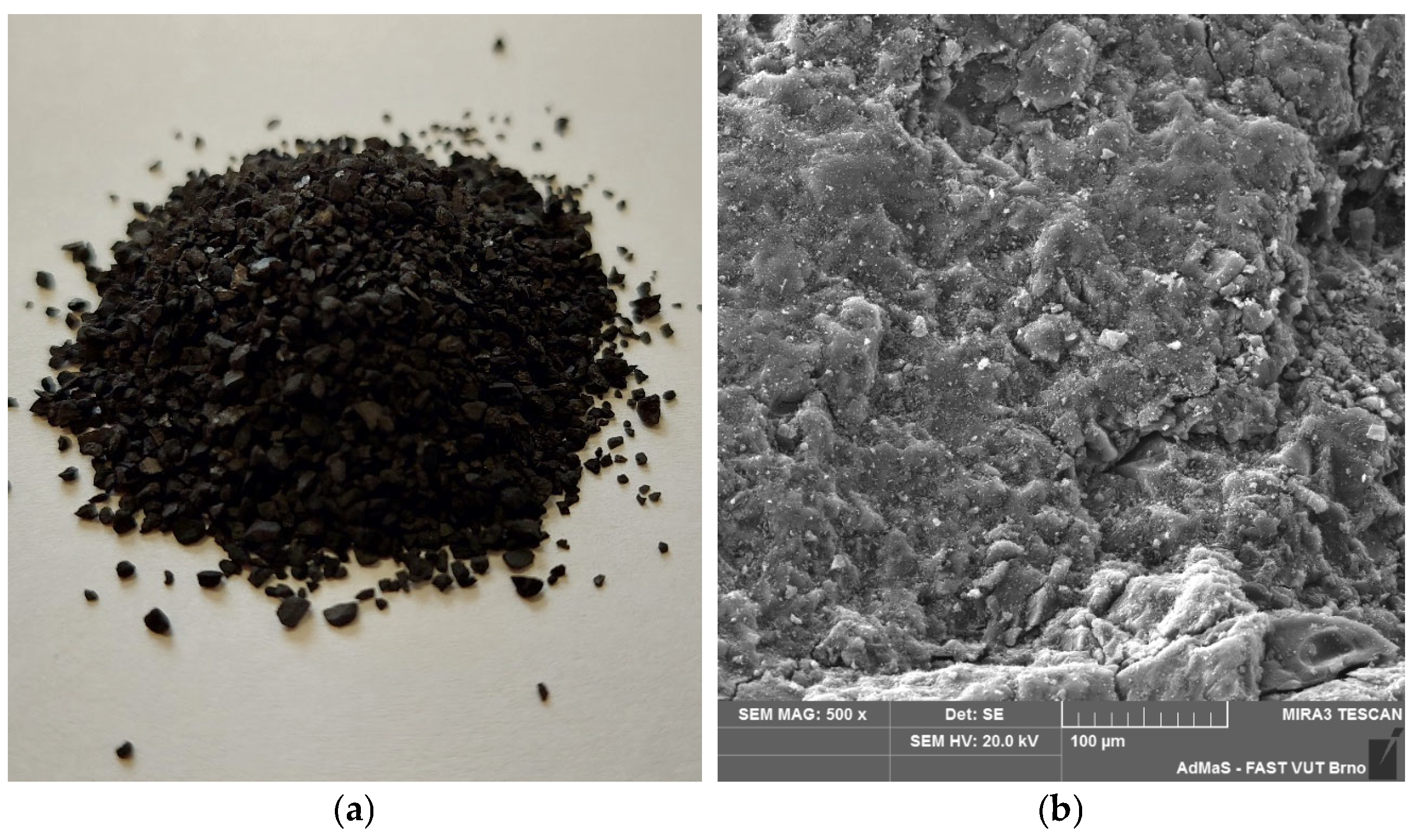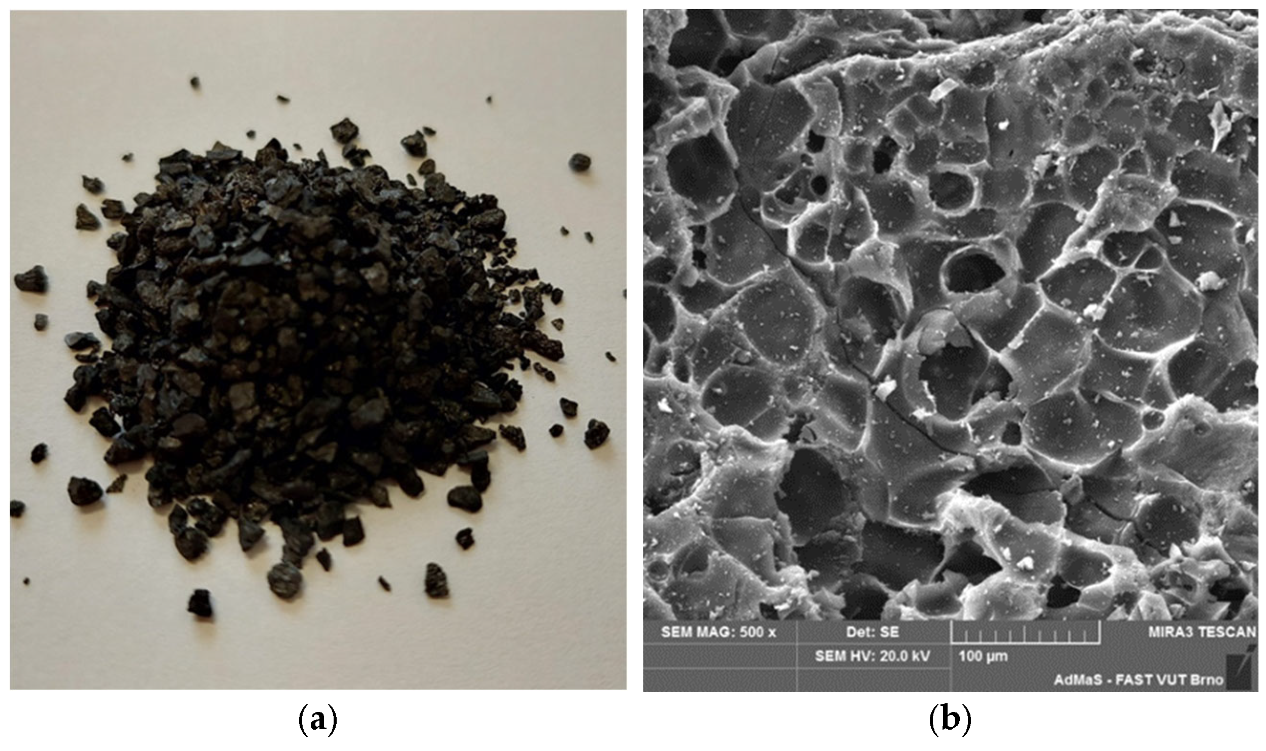 Figure 1. (a) Filtrasorb F100 sorption material in its original size; (b) Filtrasorb F100 sorption material at microscopic magnification.