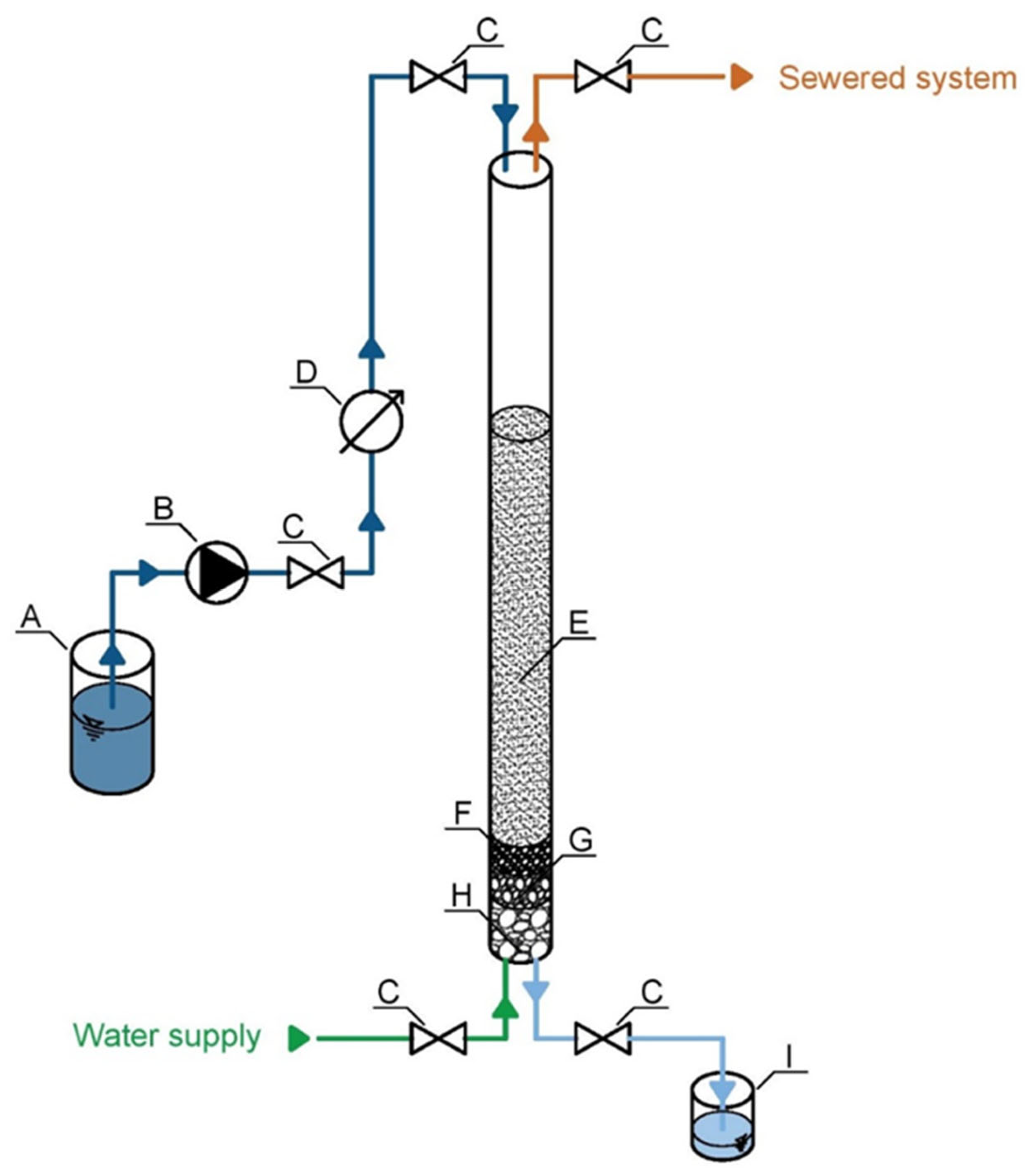 Figure 3. The diagram of the filter device. A—barrel with model water, B—pump, C—stop valves, D—flow meter, E—sorption material, F—2 mm glass beads, G—4 mm glass beads, H—1–2 cm grit drainage, I—beaker with filtered water.