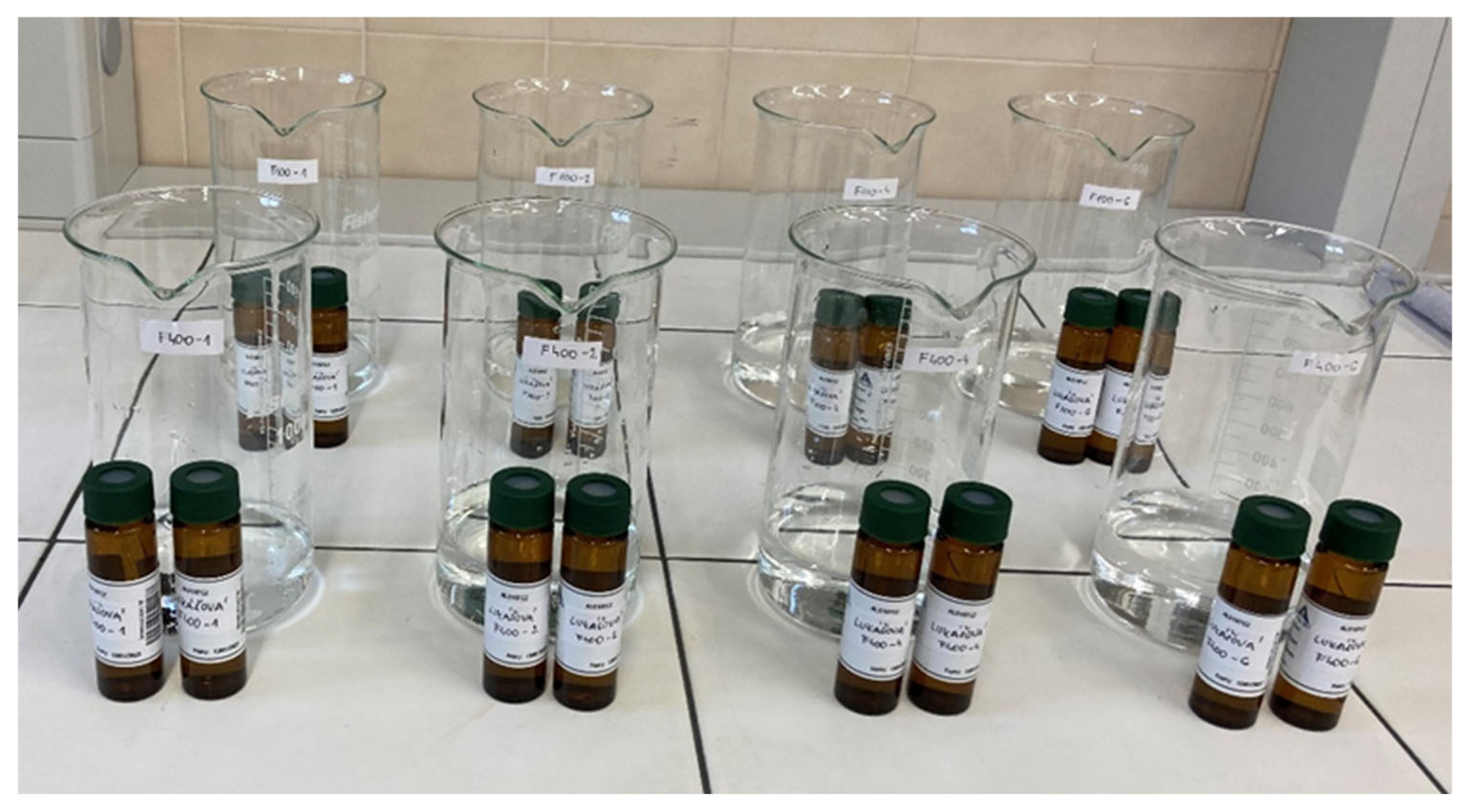 During filtration through the two activated carbons, water samples were taken at 1, 2, 4 and 6 min (Figure 5) and the pH, temperature, turbidity and concentrations of each pharmaceutical were measured. Only the concentrations of the pharmaceuticals were determined by the accredited laboratory ALS Czech Republic; the other parameters were determined in the laboratory of the Institute of Municipal Water Management of Faculty of Civil Engineering at Brno University of Technology.