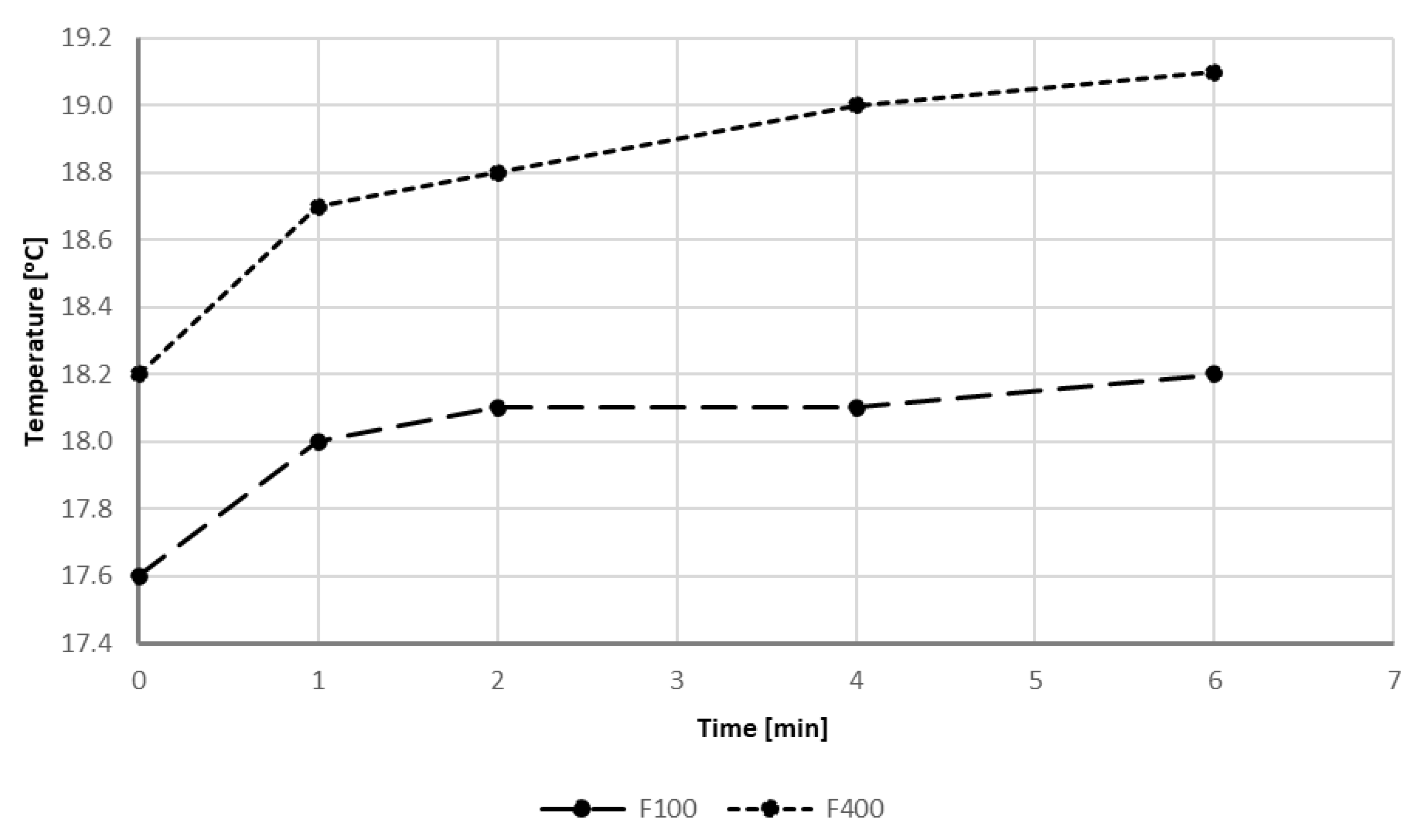 Temperature is also one of the important indicators of drinking water. The optimum temperature for drinking water is between 8 and 12 °C [21]. The water temperature during the laboratory test ranged from 17.6 °C to 19.1 °C (Figure 7). The higher measured water temperature during filtration through Filtrasorb F400 was due the fact that the experiment with this sorbent was the second in the series. The temperature of the model water therefore increased due to the temperature in the laboratory. During filtration, the water was heated by a running pump.