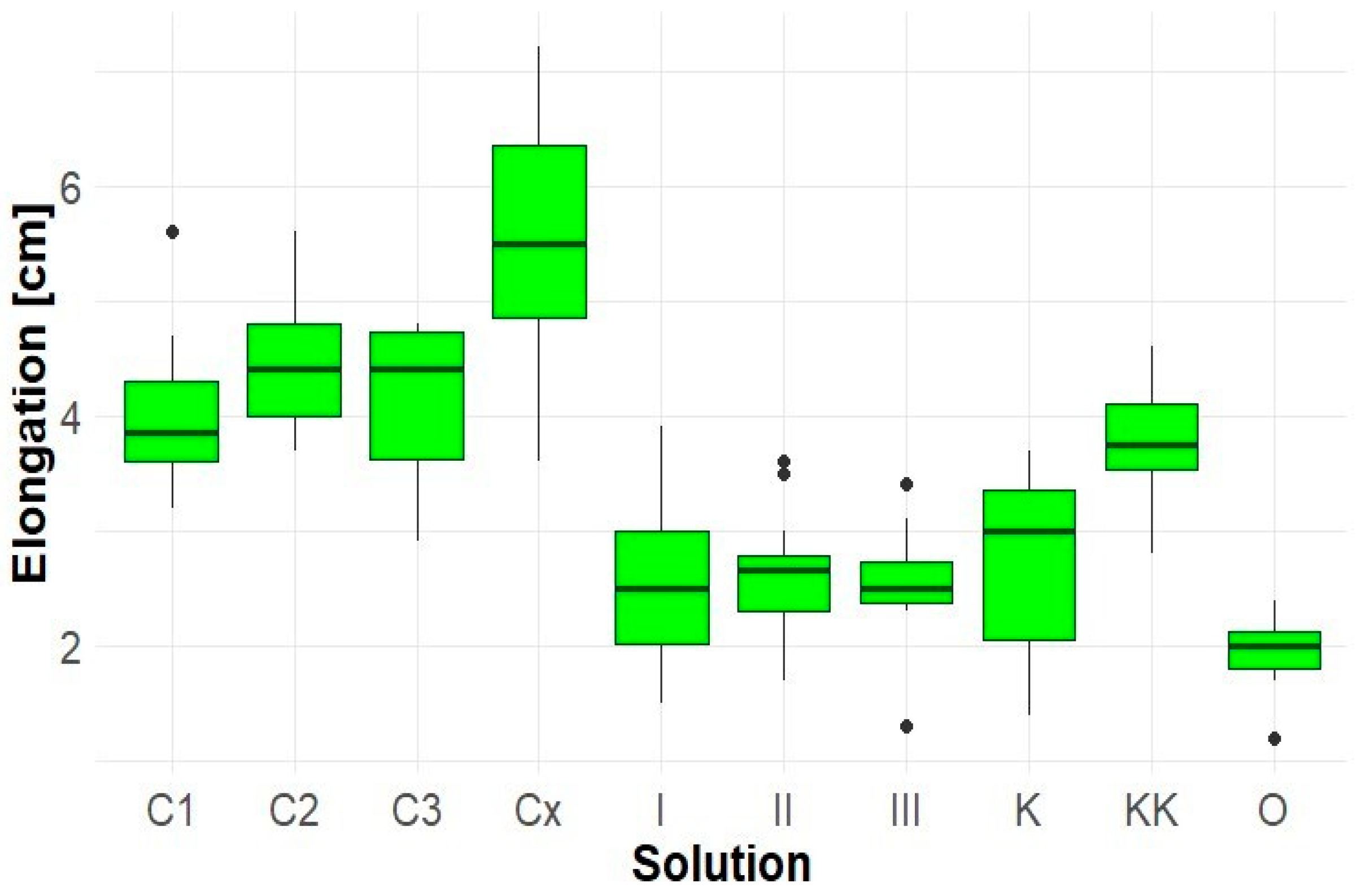 Figure 3). The lowest elongation was recorded in sample O (1 cm), which also exhibited pronounced necrotic changes. The average root lengths in control samples were: K—8.8 cm, KK—9.5 cm.