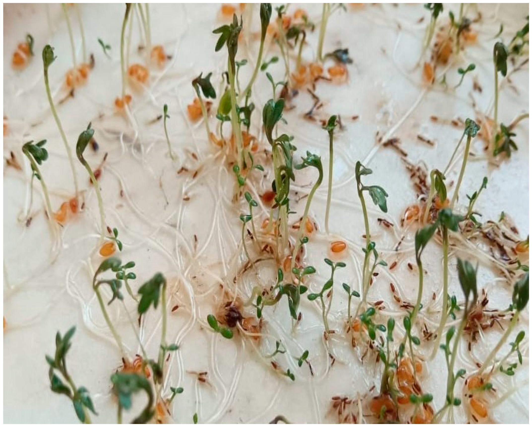 Lepidium sativum in sample KK was sown as an intercrop on 14 January 2025, after the emergence of cotyledons of Solidago canadensis. Germination began on 16 January 2025, and all control and treatment samples were maintained under identical environmental conditions.