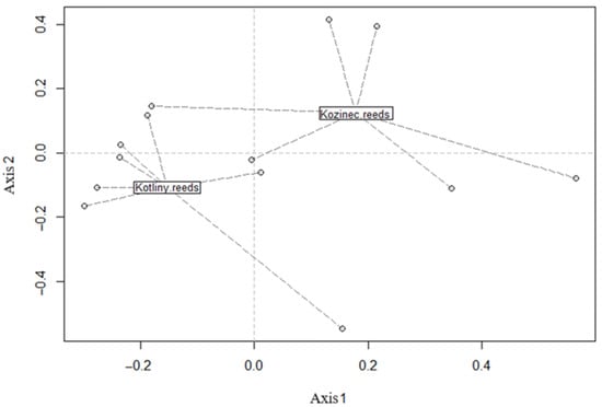 The assessment of shoreline zones focused on the reeds stands at both model sites—Kozinec and the Doubrava basins. It was found that the reeds at both sites are relatively similar in terms of species composition across different sections of these locations (see Figure 2). However, the reeds at Kozinec exhibit greater variability in species composition among individual plots, likely due to the differing characteristics of these shoreline zones, despite belonging to the same habitat type. In contrast, the reeds at the Doubrava basins appear to be more species-stable and less variable, with relatively homogeneous species composition in the shoreline zone. This is likely attributable to the smaller area of this site.