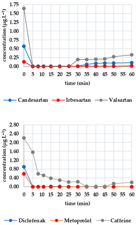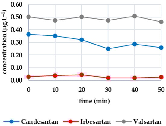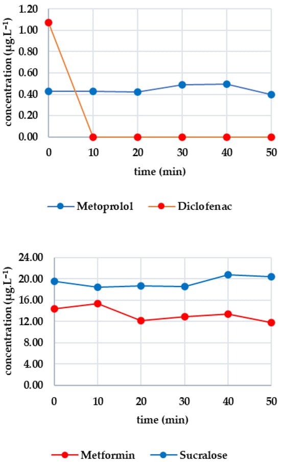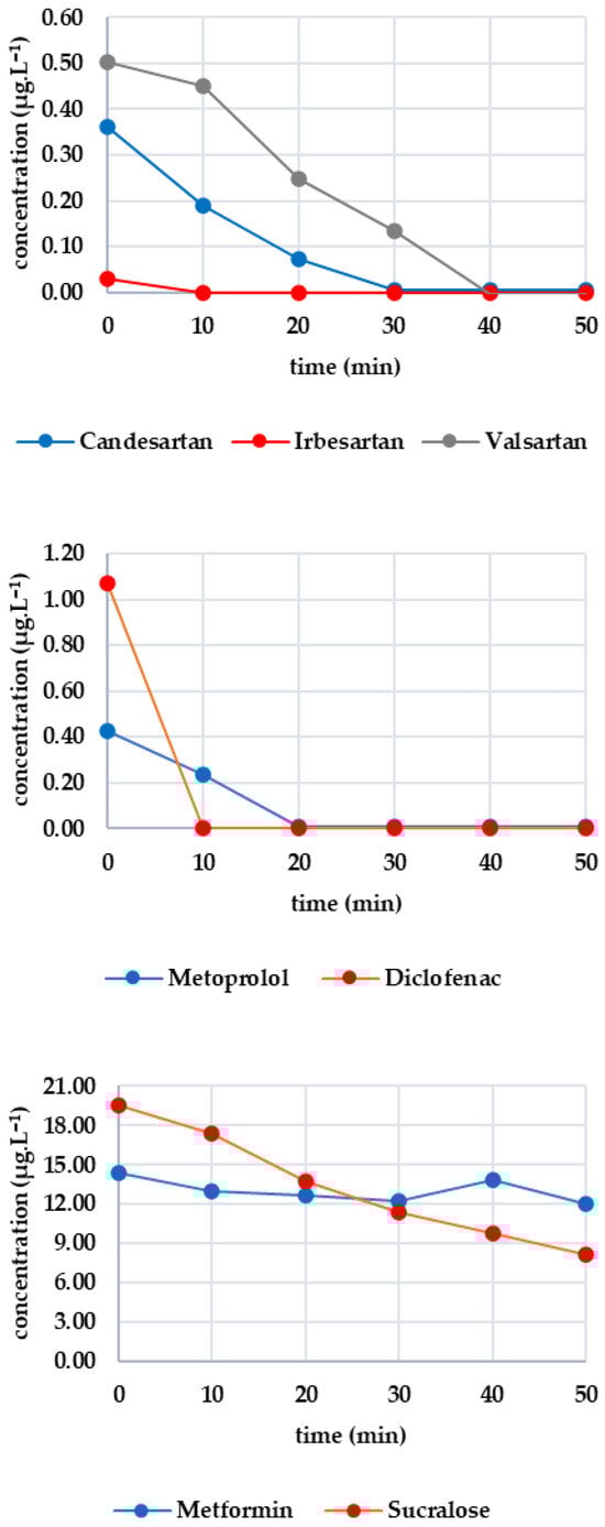 Figure 1 shows the efficacy of UV irradiation, with the first group of analytes consisting of candesartan, irbesartan and valsartan. The initial concentrations were 0.363 μg·L−1, 0.030 μg·L−1 and 0.504 μg·L−1, respectively. After 50 min, the candesartan concentration decreased by 21.10% (to 0.261 μg·L−1). The decrease was negligible for irbesartan (13.33%) and was only 8.13% for valsartan; this variation in values indicates a possible measurement error. Therefore, UV radiation does not significantly degrade these drugs. The second group includes diclofenac and metoprolol. Caffeine was below the limit of detection; therefore, the graphical plot is not shown. Diclofenac was completely degraded after 10 min, whereas the concentration of metoprolol (initially 0.429 μg·L−1) did not decrease significantly. Due to the fluctuations in the measurements (e.g., an increase after 40 min), the decrease may be more attributable to experimental error. Therefore, UV radiation is only effective on diclofenac. The third group consists of metformin and sucralose. The initial metformin concentration was 14.413 μg·L−1, decreasing by 18.37% to 11.765 μg·L−1 after 50 min. Sucralose, on the other hand, increased slightly (from 19.504 to 20.402 μg·L−1), confirming its resistance to UV irradiation. In this case, the effectiveness of UV irradiation is limited.